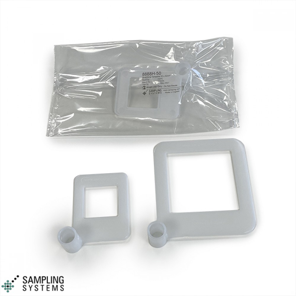 The single use, plastic template will be in contact with the item being swabbed. In order to minimise the risk of sampling error the Swabbing Templates are made and packed within a Cleanroom.